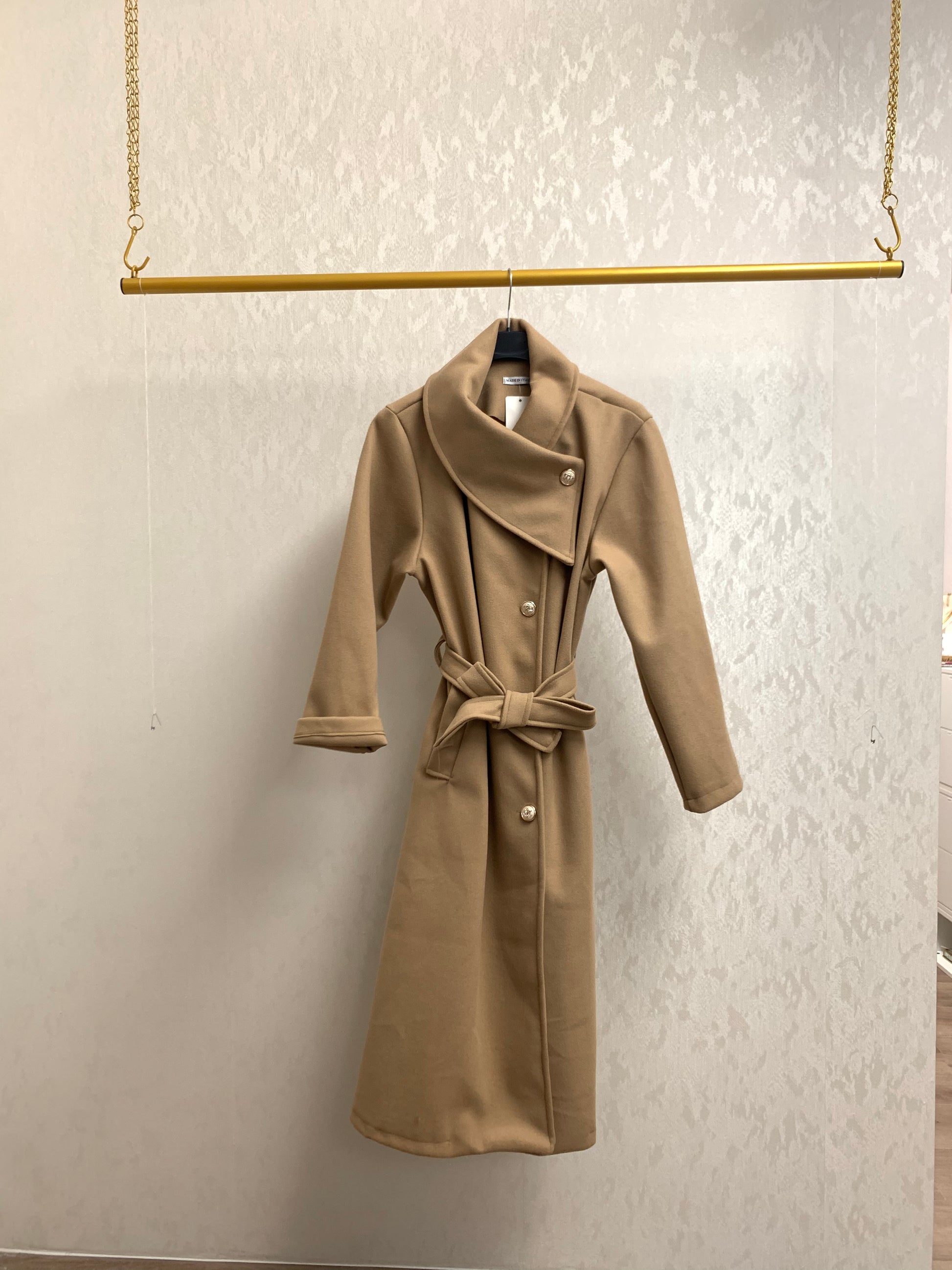 Eleganter, langer Mantel mit goldenen Knöpfen, praktischem Gürtel und sehr modern geschnittenem Kragen für einen stilvollen Akzent. Der Schnitt passt bequem von XS bis L und verleiht jedem Outfit einen modernen, schicken Look – ideal für Alltag, Büro oder besondere Anlässe.