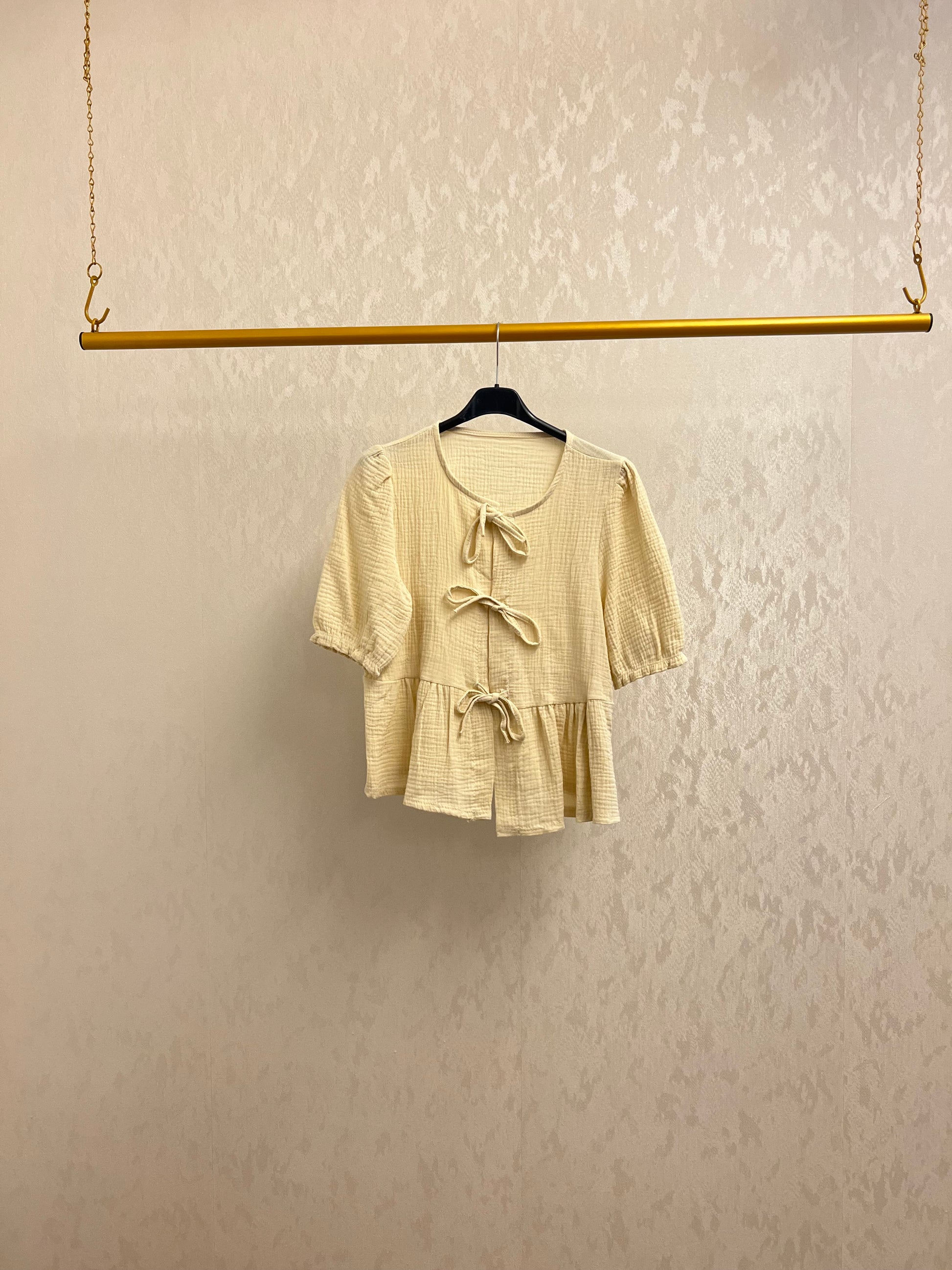 Dieses besondere T-Shirt kombiniert die leichte, weiche Struktur von Musselin mit dem Komfort eines legeren Strick-Designs. Der lockere Schnitt und die feminine Schleife zum Schließen vorn verleihen dem Shirt einen charmanten, lässigen Look.