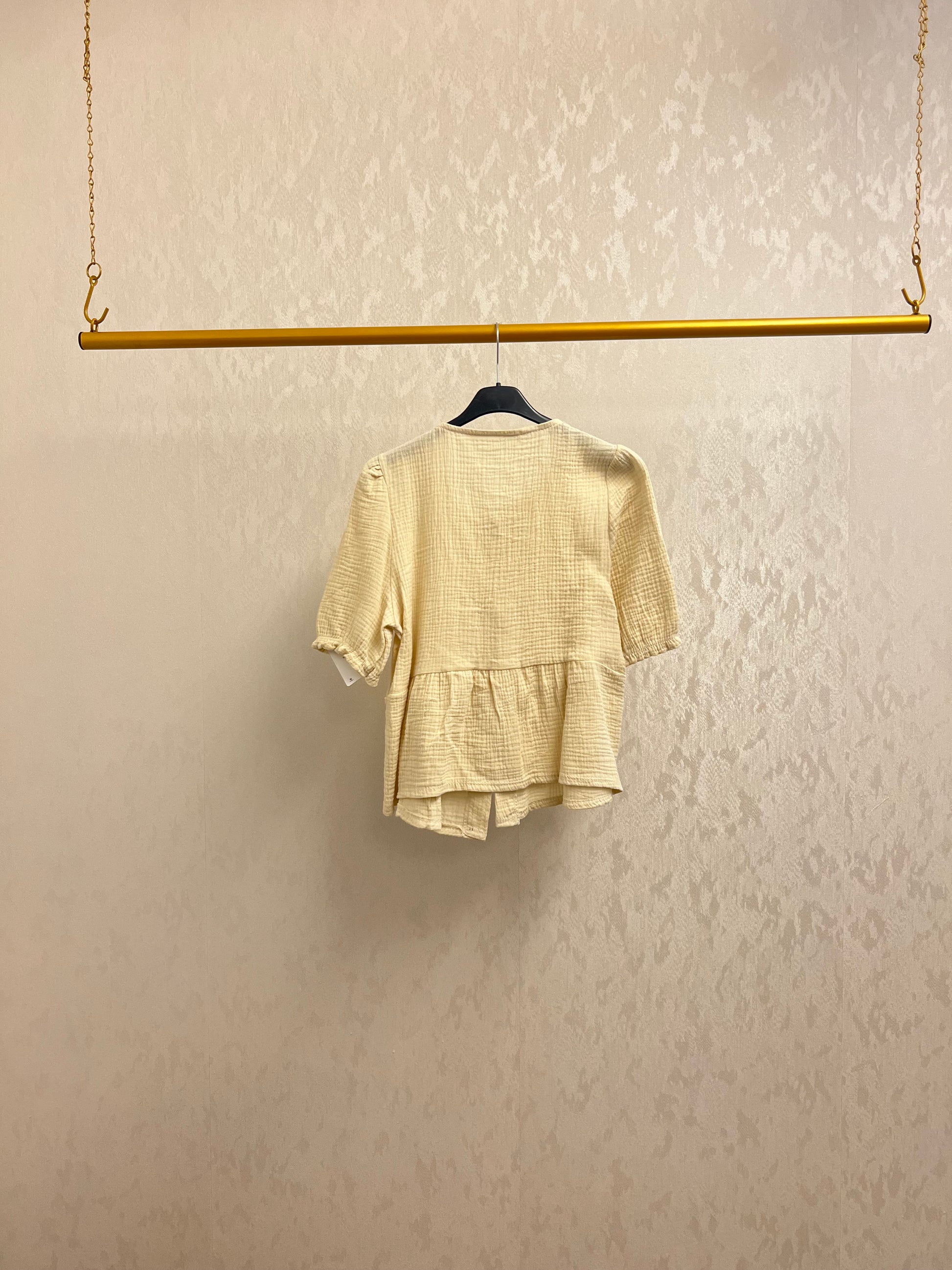 Ob als leichtes Oberteil an warmen Tagen oder als verspieltes Layering-Piece – dieses Musselin-T-Shirt ist vielseitig einsetzbar und passt sich durch die Einheitsgröße unterschiedlichen Körperformen entspannt an.