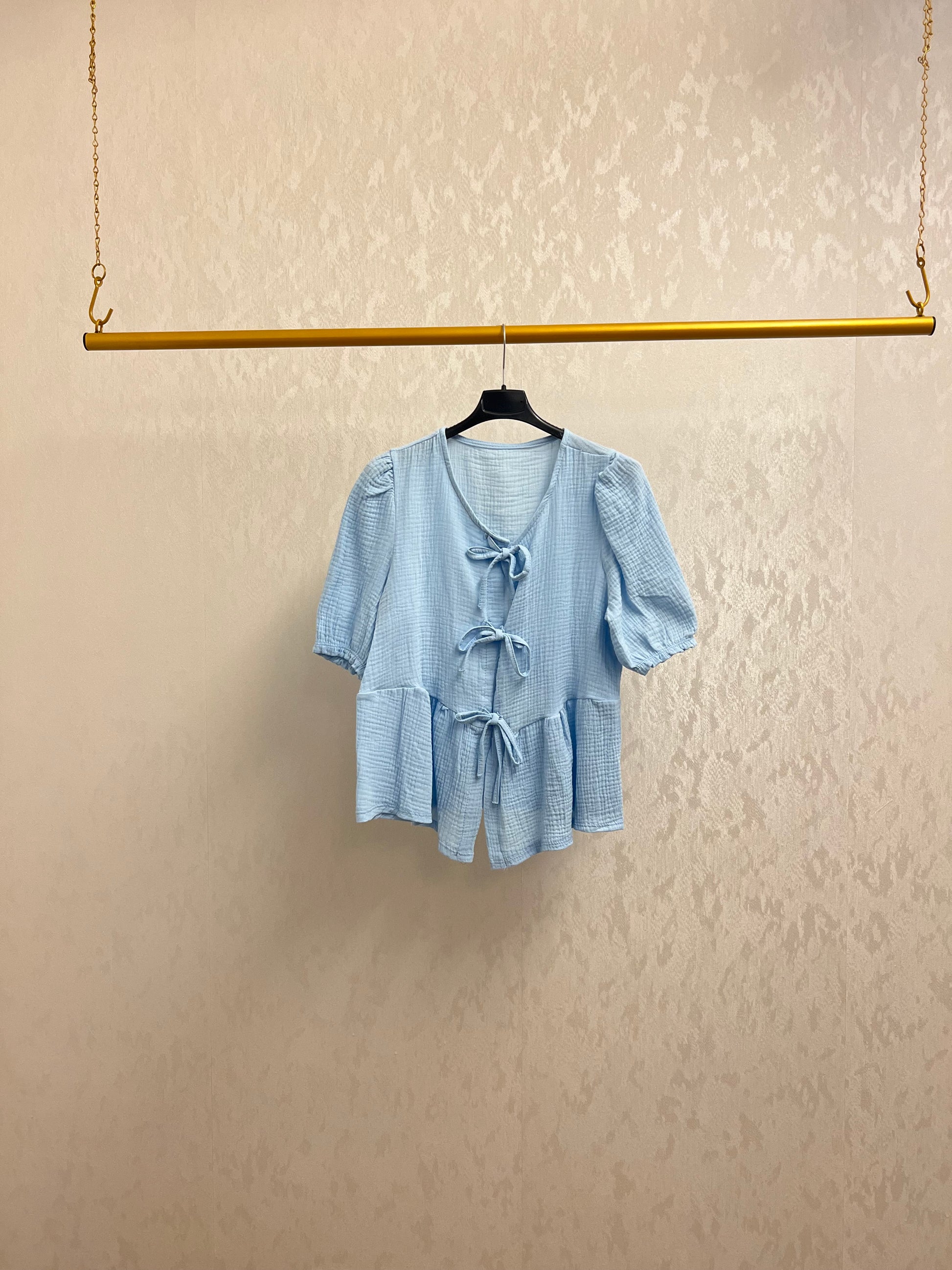 Dieses besondere T-Shirt kombiniert die leichte, weiche Struktur von Musselin mit dem Komfort eines legeren Strick-Designs. Der lockere Schnitt und die feminine Schleife zum Schließen vorn verleihen dem Shirt einen charmanten, lässigen Look.