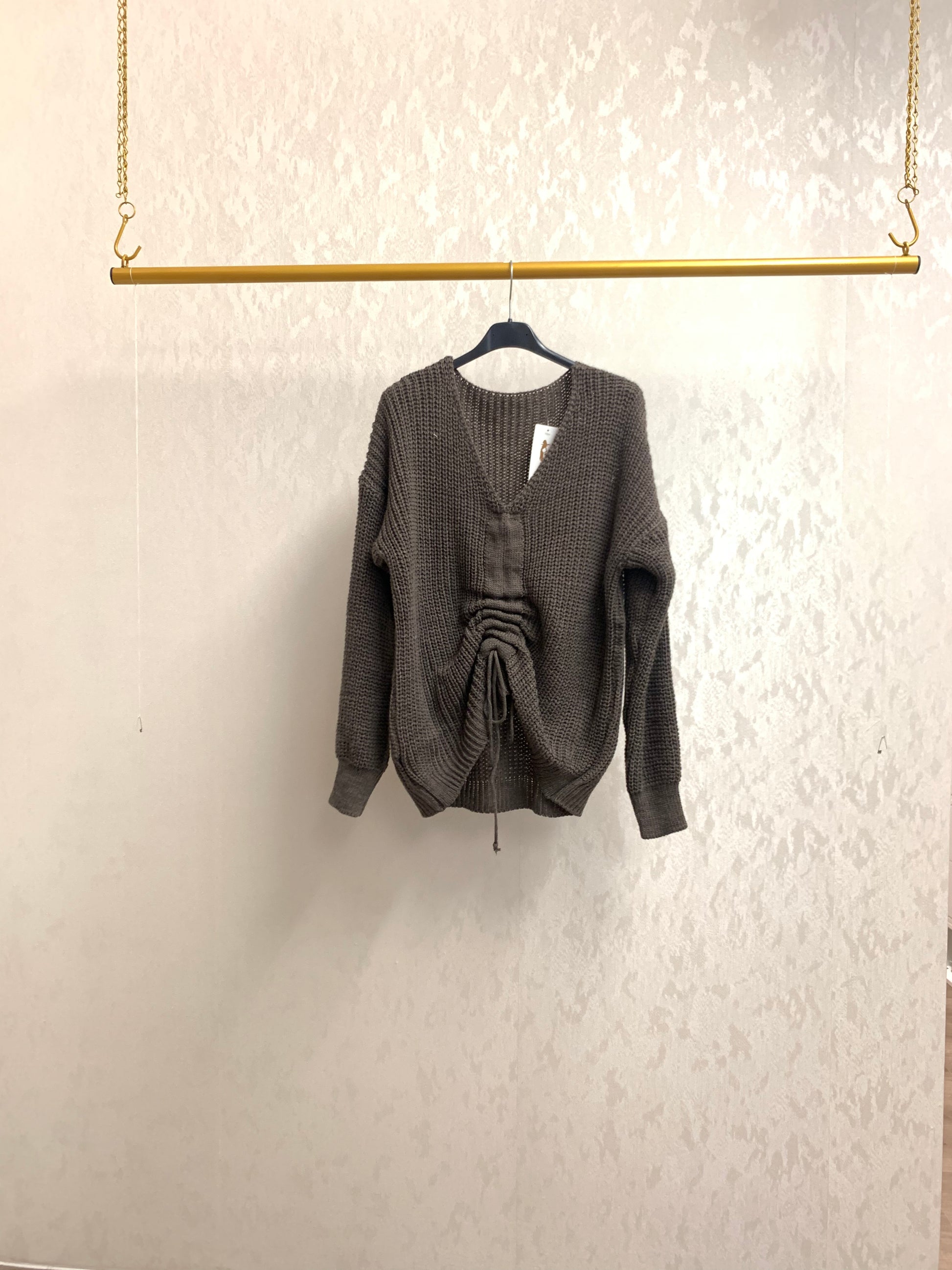 Modischer Pullover mit V-Ausschnitt und verstellbarer Front-Raffung mittels Seil, sodass du die Passform individuell stylen kannst. Der lockere Schnitt sorgt für einen modernen, schmeichelnden Look und passt ideal von XS bis XL. Perfekt für stylische Alltags- und Streetstyle-Outfits – bequem, vielseitig & trendy.