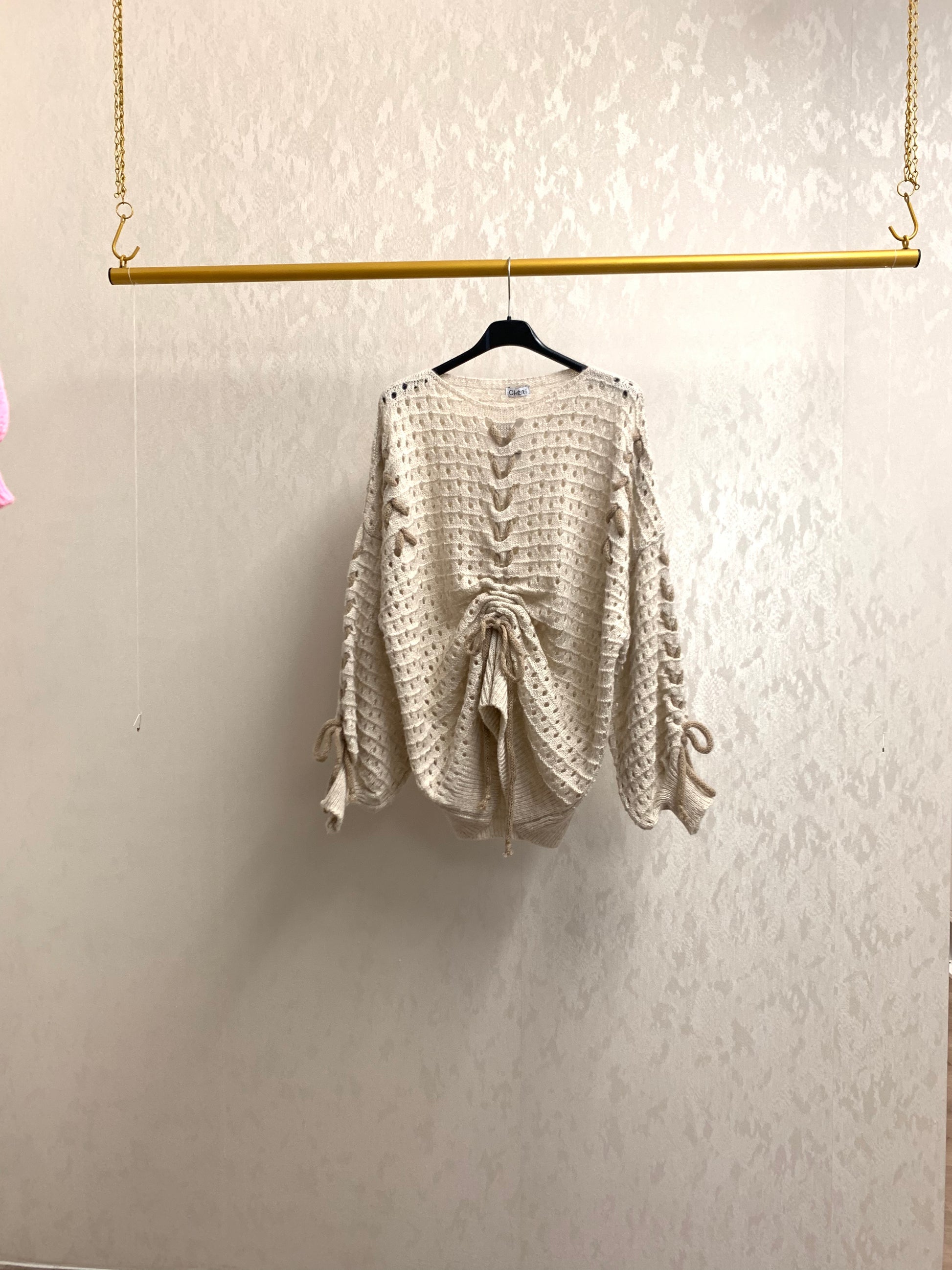 Trendy Pullover mit Raffung vorne und an den Ärmeln, verstellbar über dekorative Seile. Der lockere Schnitt sorgt für Komfort und passt ideal von XS bis XL. Perfekt für lässige Alltags- oder Streetstyle-Looks – bequem, modern und vielseitig kombinierbar.